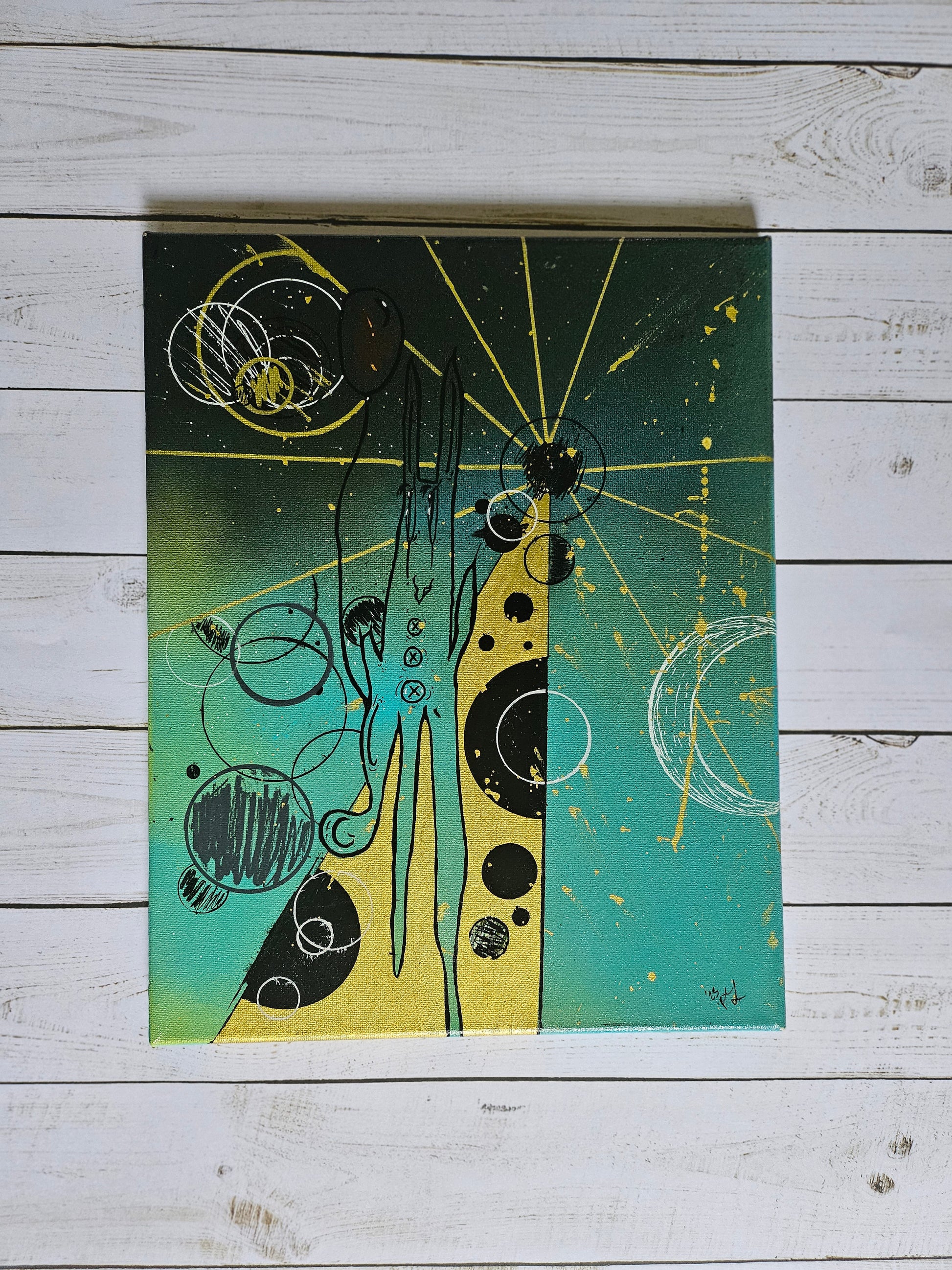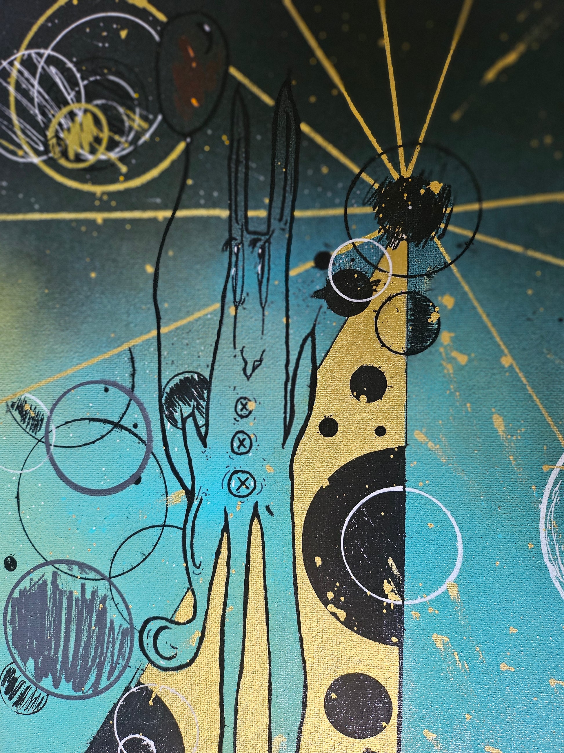 'Birthday boy' is an original painting by Rebekah Greene representative of the star sign Libra. This piece holds quite a few easter eggs, including a slightly hidden balloon; with geometric patterns and linework to represent space & time.